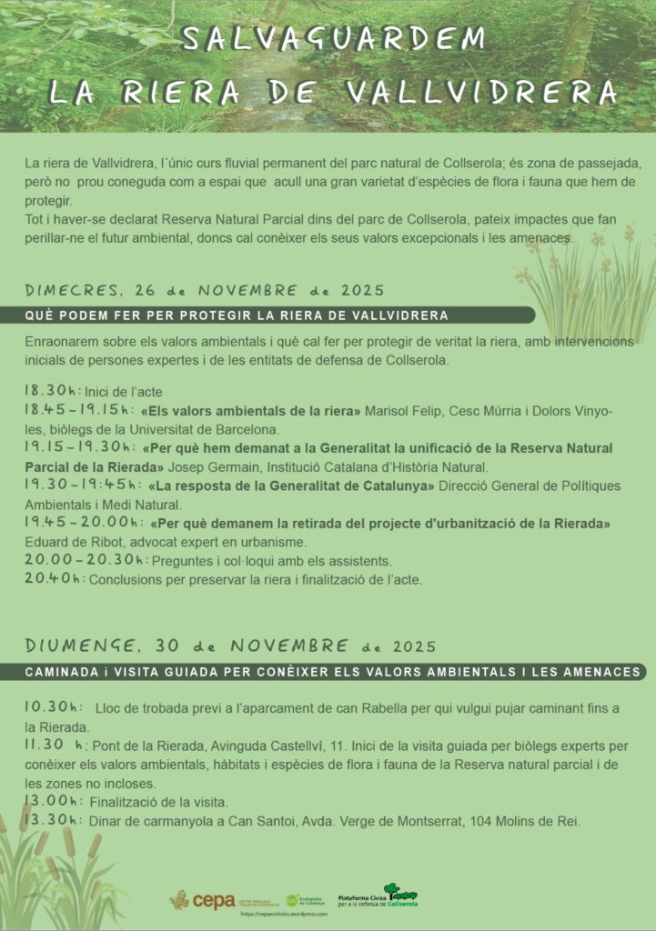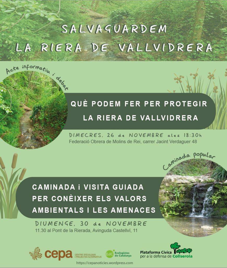 El passat dimecres, 26 de novembre, conjuntament, el Centre d’Ecologia i Projectes Alternatius i la plataforma Cívica per la Defensa de Collserola, vam organitzar l’acte titulat SALVAGUARDEM LA RIERA DE VALLVIDRERA- QUÈ PODEM FER PER PROTEGIR LA RIERA DE VALLVIDRERA.